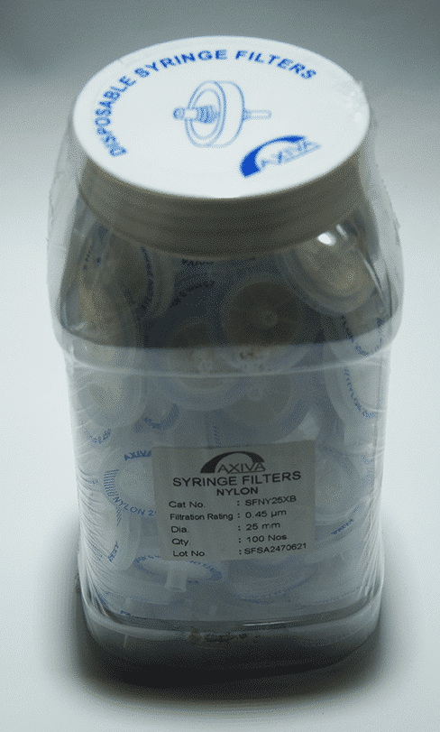 Filtro de Jeringa de Nylon. Diámetro: 25 mm. Tamaño de poro: 0,45 Micras. Caja x 100 unidades